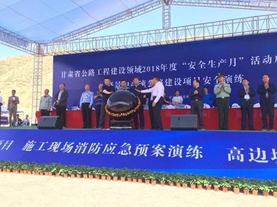 上午9:50,由省交通質(zhì)監(jiān)局局長(zhǎng)趙河清宣布啟動(dòng)儀式開(kāi)始,省交通質(zhì)監(jiān)局、公航旅集團(tuán)安環(huán)部、蘭州新區(qū)安監(jiān)局、甘肅路橋公路投資有限公司、景中項(xiàng)目辦相關(guān)領(lǐng)導(dǎo)共同按下啟動(dòng)球,標(biāo)志著全省公路工程建設(shè)領(lǐng)域“安全生產(chǎn)月”活動(dòng)正式開(kāi)始,并為景中項(xiàng)目參建單位贈(zèng)送了安全管理管理類書(shū)籍及光盤(pán)。