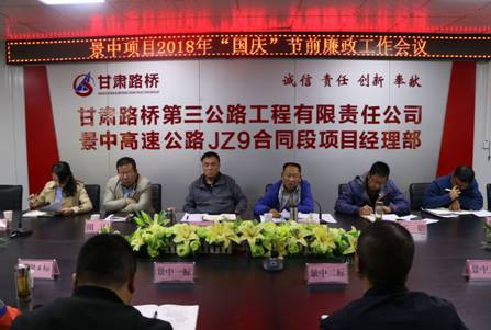 為進(jìn)一步貫徹落實(shí)中央八項(xiàng)規(guī)定實(shí)施細(xì)則精神,嚴(yán)防國(guó)慶期間“四風(fēng)”問(wèn)題,切實(shí)增強(qiáng)項(xiàng)目建設(shè)管理人員廉潔自律意識(shí),扎實(shí)推進(jìn)黨風(fēng)廉政建設(shè),力保廉潔過(guò)節(jié)。2018年9月30日,景中項(xiàng)目辦組織召開了“國(guó)慶”節(jié)前廉政工作會(huì)議,集體約談了項(xiàng)目辦全體員工,路基、綠化單位項(xiàng)目經(jīng)理,路基單位項(xiàng)目書記,主管安全副經(jīng)理,各監(jiān)理駐地辦高監(jiān)、安全專監(jiān),中心實(shí)驗(yàn)室主任。